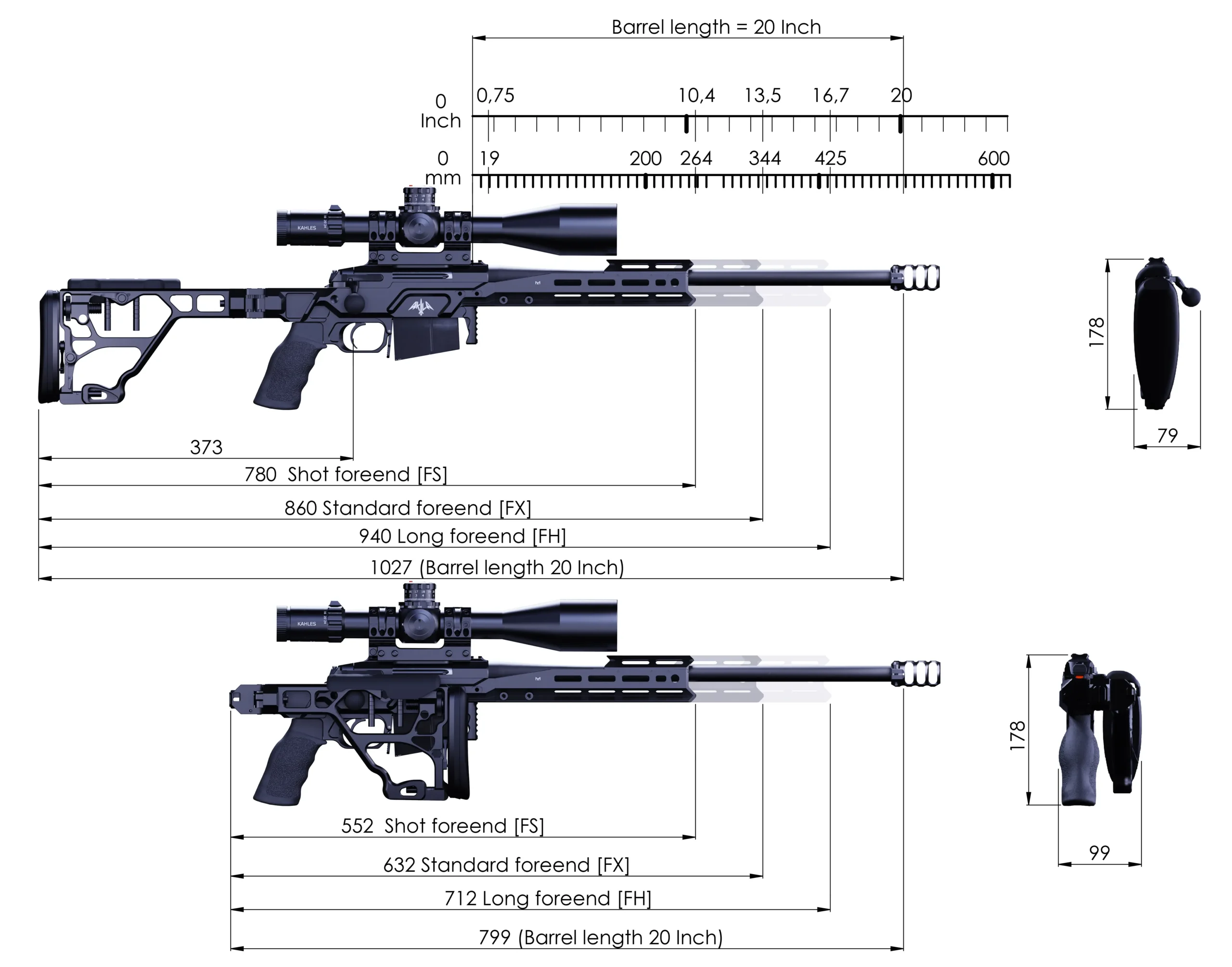 Diese Konfiguration bietet ein ideales Verhältnis von Gewicht, Stabilität und Bedienkomfort. Der AKILA-Schaft ist nur für die Kaliber .308 Win. und 6,5 Creedmoor erhältlich.